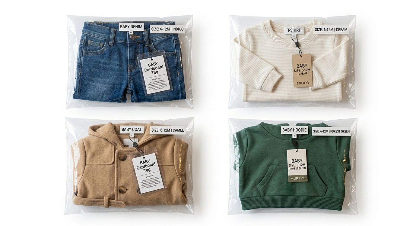 Include magliette, pantaloni, felpe, giacchine, vestiti e tutine per neonato, tutti selezionati con particolare attenzione alla qualità e all’assenza di difetti. Ogni capo viene igienizzato e imbustato singolarmente per garantire igiene e presentabilità immediata.